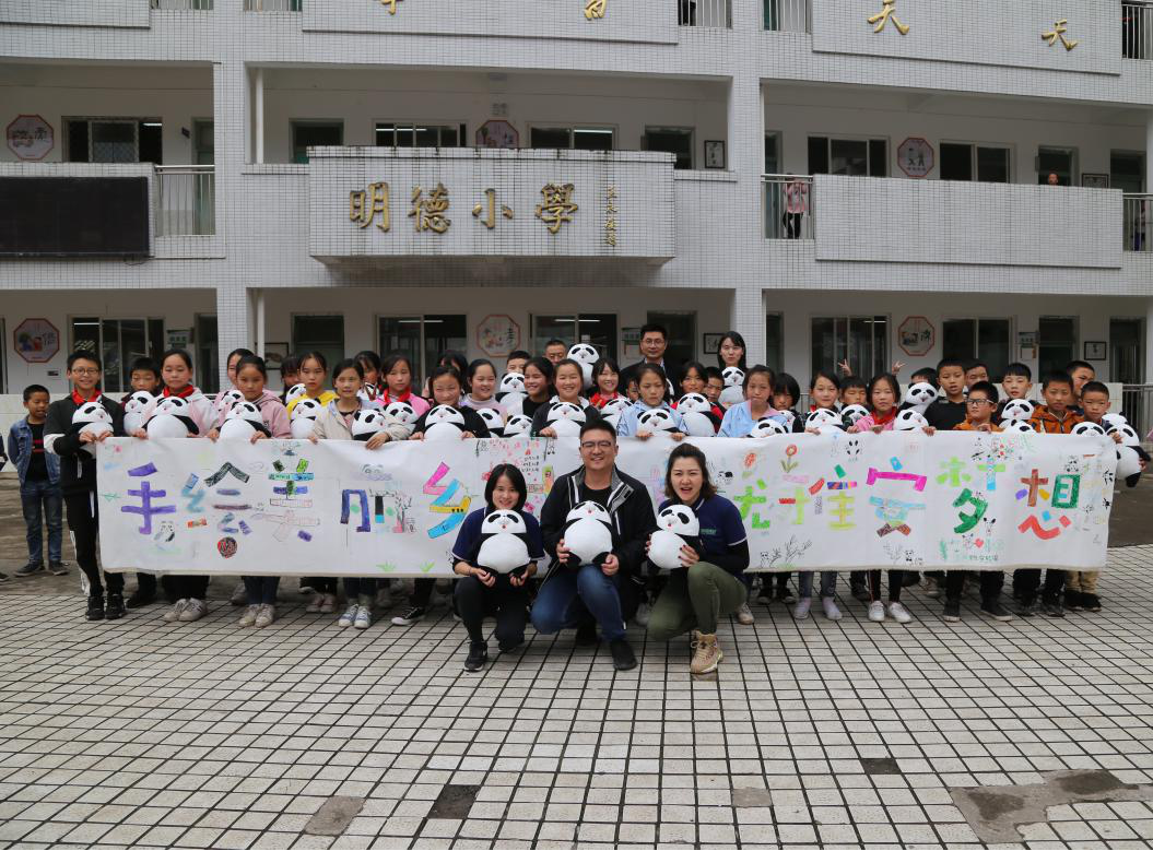 绘画课结束后,38只雅安“熊猫灯会”的明星熊猫公仔——胖墩儿,被一一送到孩子们手中,孩子们立即欢呼起来,并争相聚在一起和授课老师合影留念。