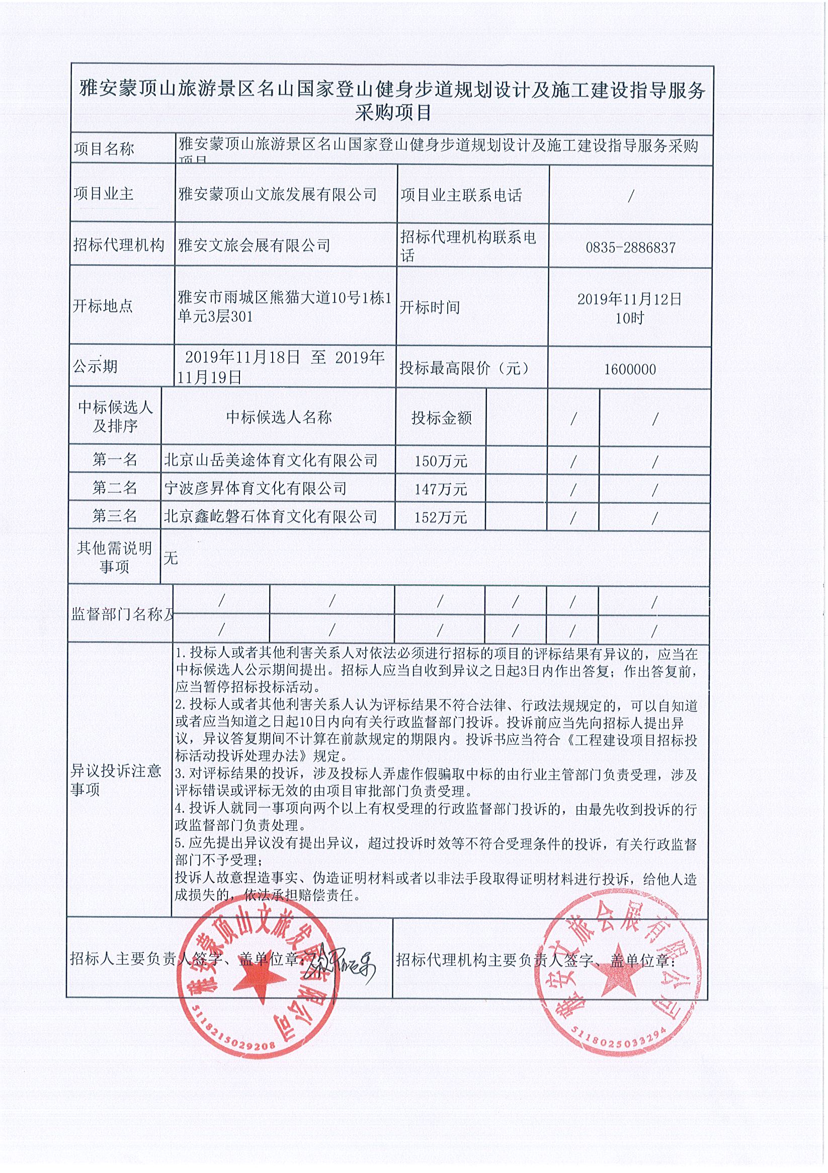 雅安蒙顶山旅游景区名山国家登山健身步道规划设计及施工建设指导服务采购项目结果公示