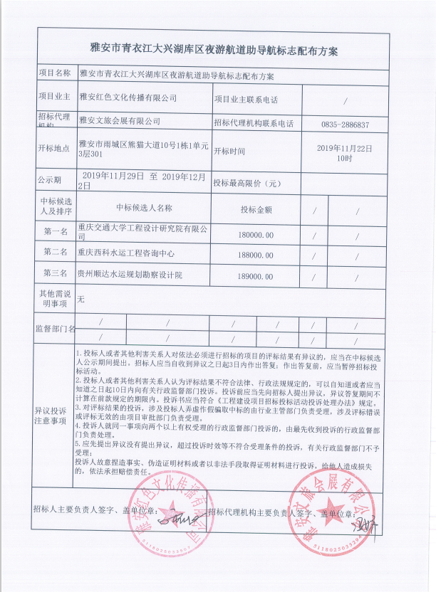 雅安市青衣江大兴湖库区夜游航道助导航标志配布方案中标公告