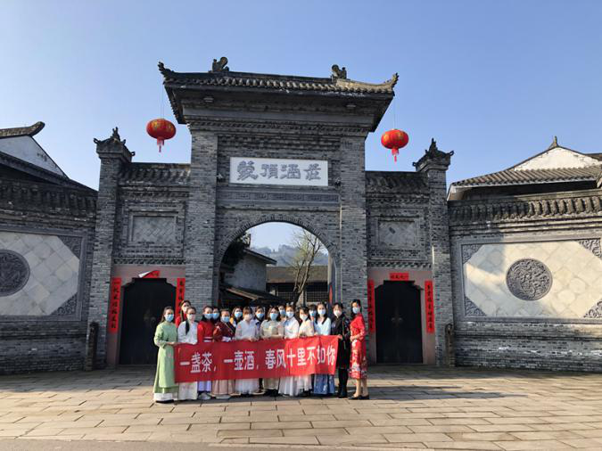 蒙顶皇茶团队全体女士着盛装,在接受了公司男同事代表祝福后,整队前往蒙顶酒庄,学习酒文化、交流个性化定制业务。