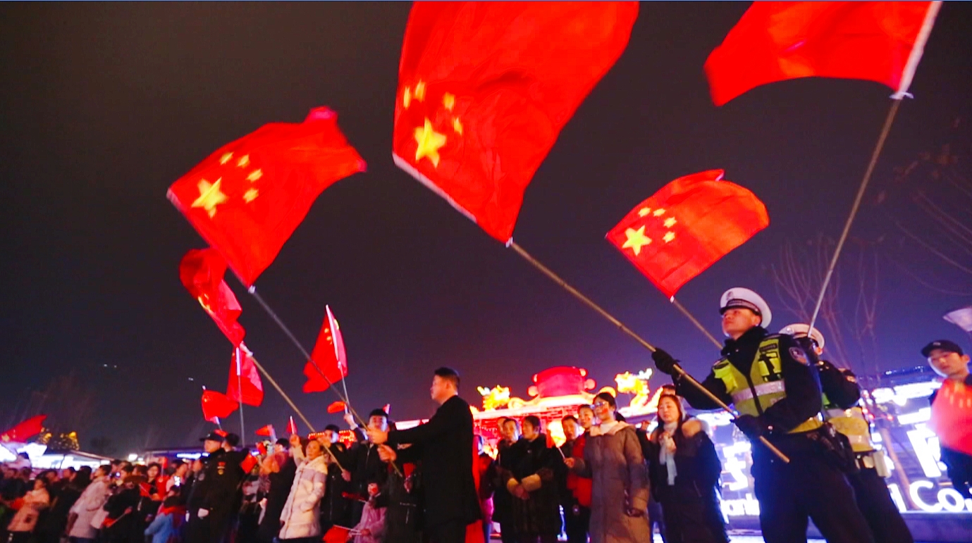 1月31日晚20:00,熊猫灯会华灯璀璨,人流熙熙攘攘。“五星红旗迎风飘扬,胜利歌声多么嘹亮……”清脆的童声突然响彻夜空,让所有人停下了脚步。音乐渐渐响起,人群中响起了唱合的声音。越来越多的人走了出来,他们身上佩戴着红色的围巾,脸上画着五星红旗,手中拿着五星红旗,一边歌唱,一边走向灯会的中心广场。一百多名快闪表演者在中心广场最具中国传统特色的“盛世宫灯”前汇聚成矩阵,二十多只大熊猫胖墩儿也手持五星红旗加入其中。“我爱你中国,心爱的母亲,我为你流泪,也为你自豪……”载歌载舞的快闪表演,很快把园内的观灯群众吸引了过来,随着歌曲的高潮,全场五星红旗都挥舞起来,人们高举双手,打着拍子,一起唱和,激情澎湃。