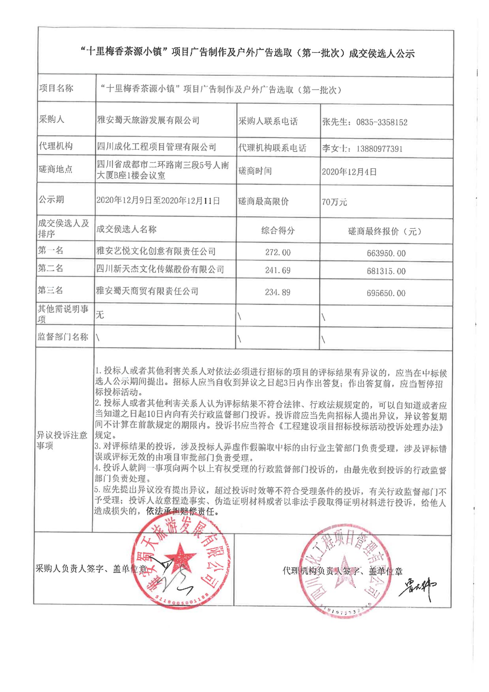 "十里梅香茶源小镇"项目广告制作及户外广告选取(第一批次)成交侯选人公示