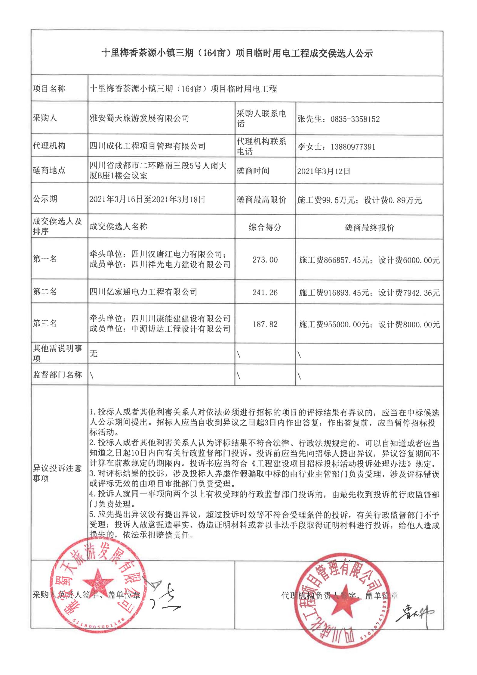 十里梅香茶源小镇三期(164亩)项目临时用电工程成交候选人公示