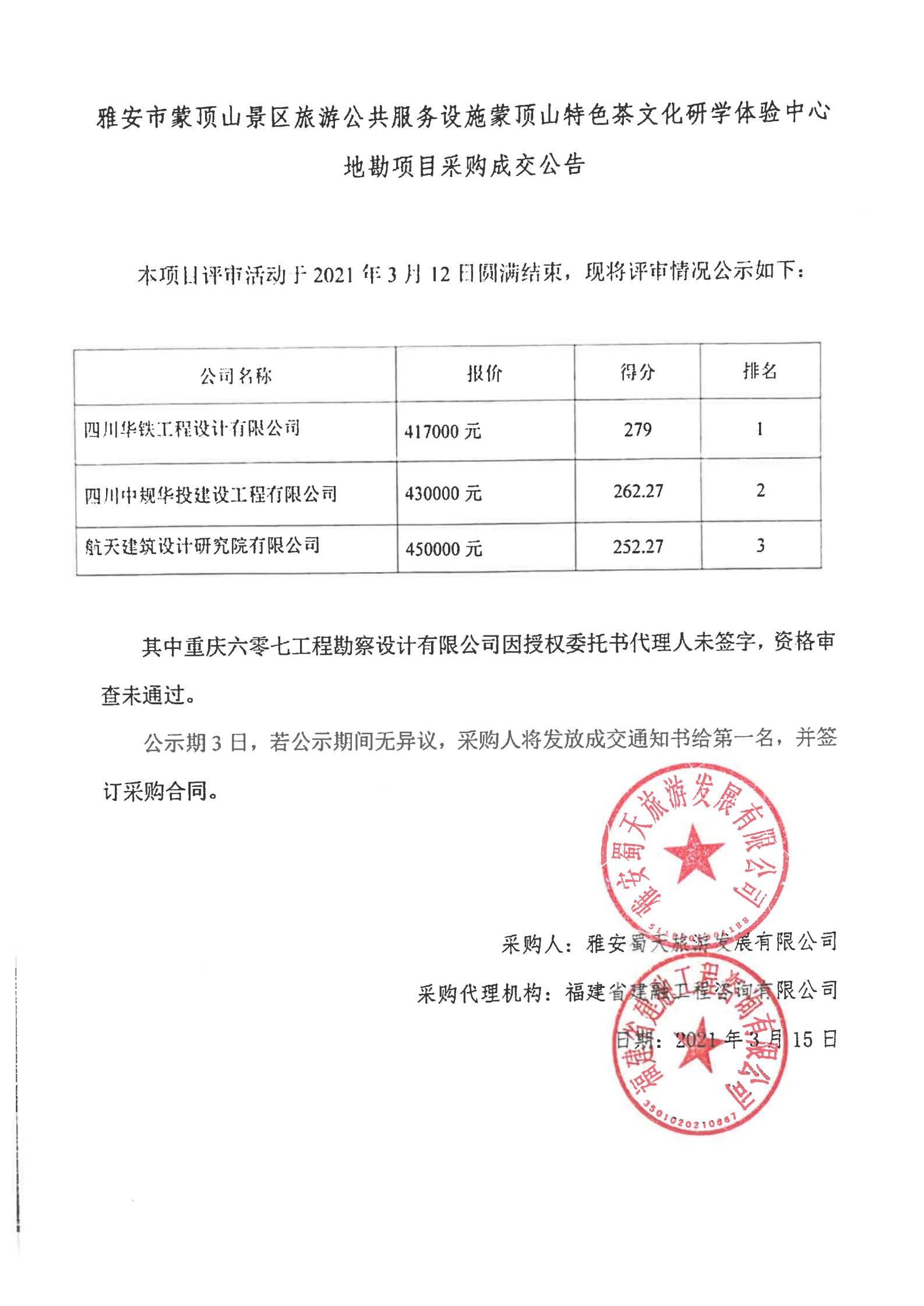 雅安市蒙顶山景区旅游公共服务设施蒙顶山特色茶文化研学体验中心地勘项目采购成交公告
