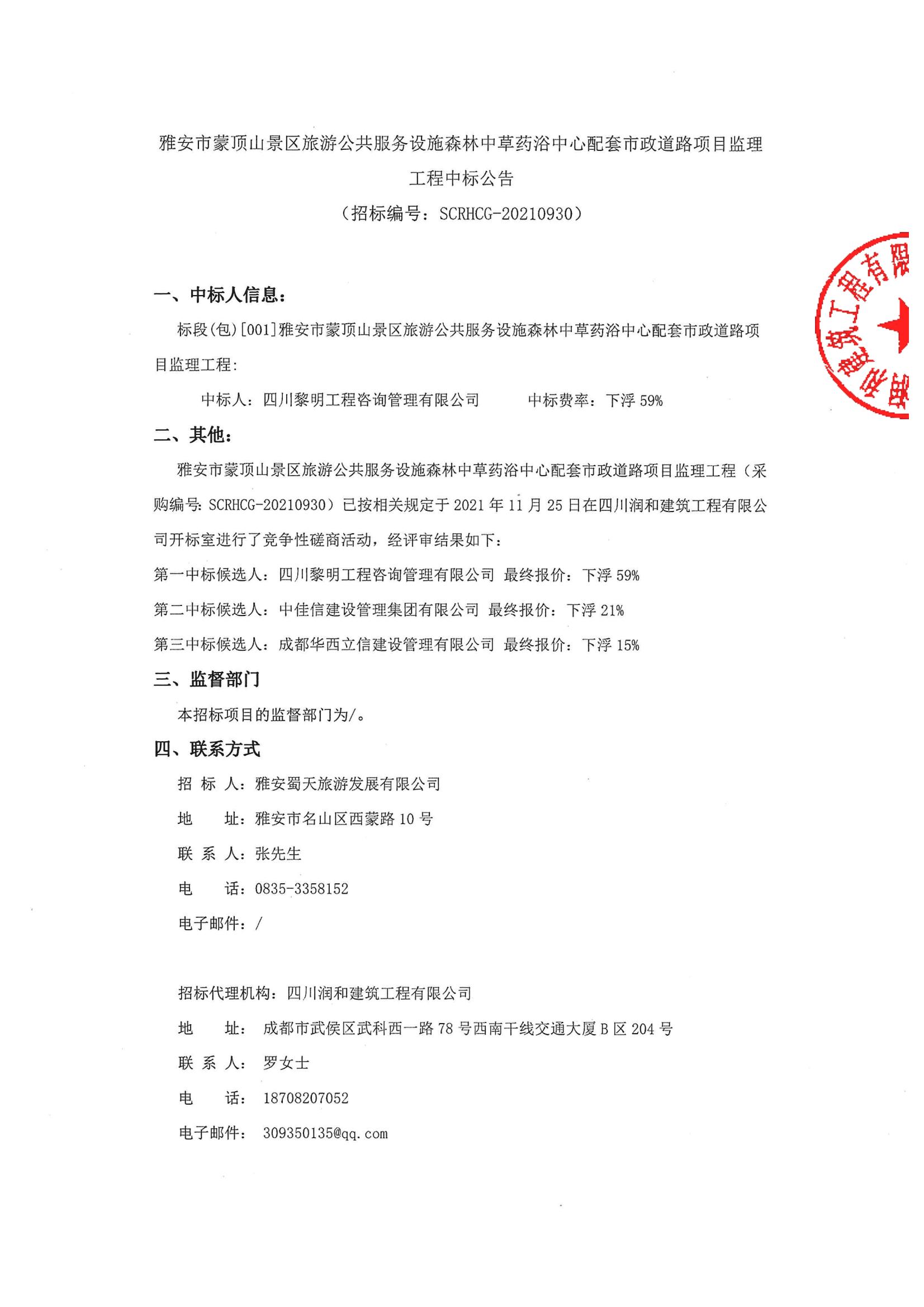 雅安市蒙顶山景区旅游公共服务设施森林中草药浴中心配套市政道路项目监理工程中标公告
