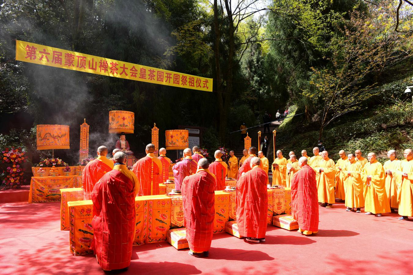 开园仪式上,在蒙顶五峰之心——皇茶园,由众僧人洒净、焚香、礼拜,然后入园采茶,再现了蒙顶山茶作为皇室贡品敬天祭祖的文化传承和历史辉煌。