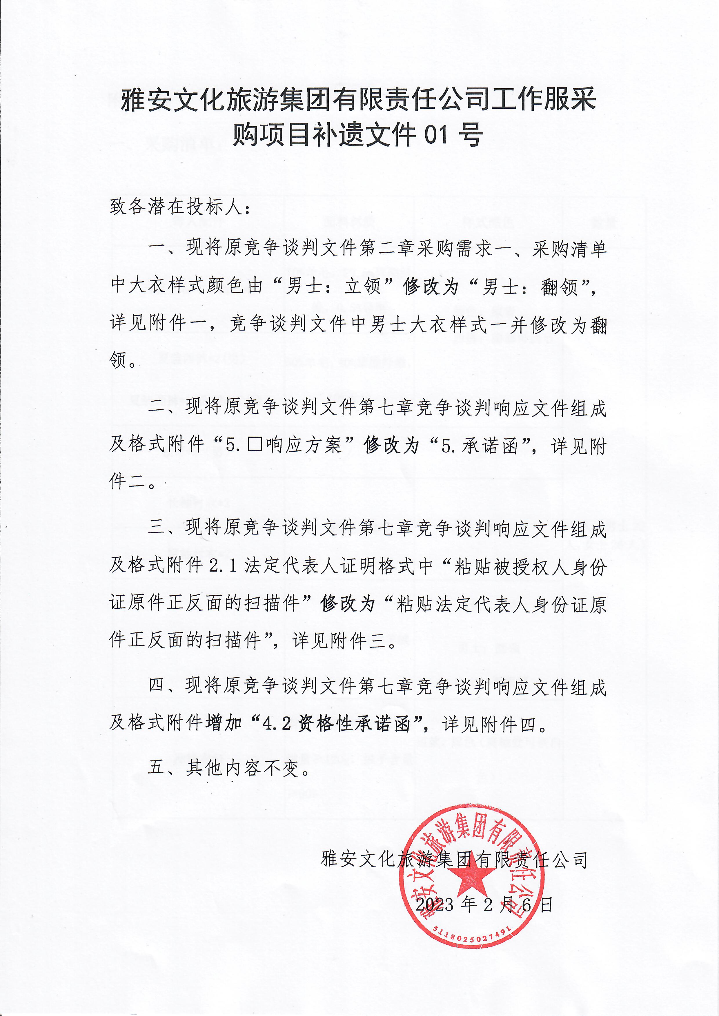 雅安文化旅游集团有限责任公司工作服采购项目补遗文件01号
