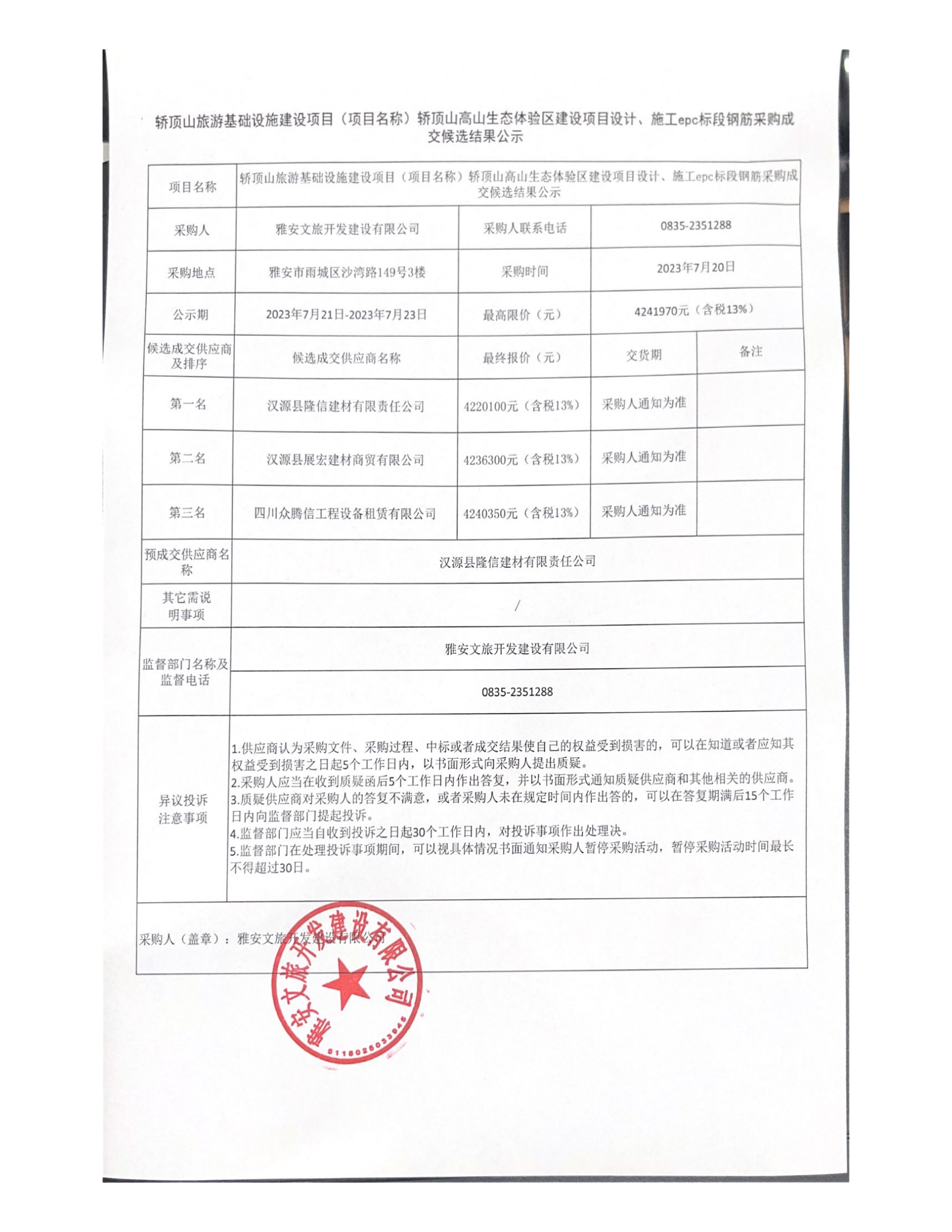轿顶山旅游基础设施建设项目(项目名称)轿顶山高山生态体验区建设项目设计、施工epc标段钢筋采购候选结果公示