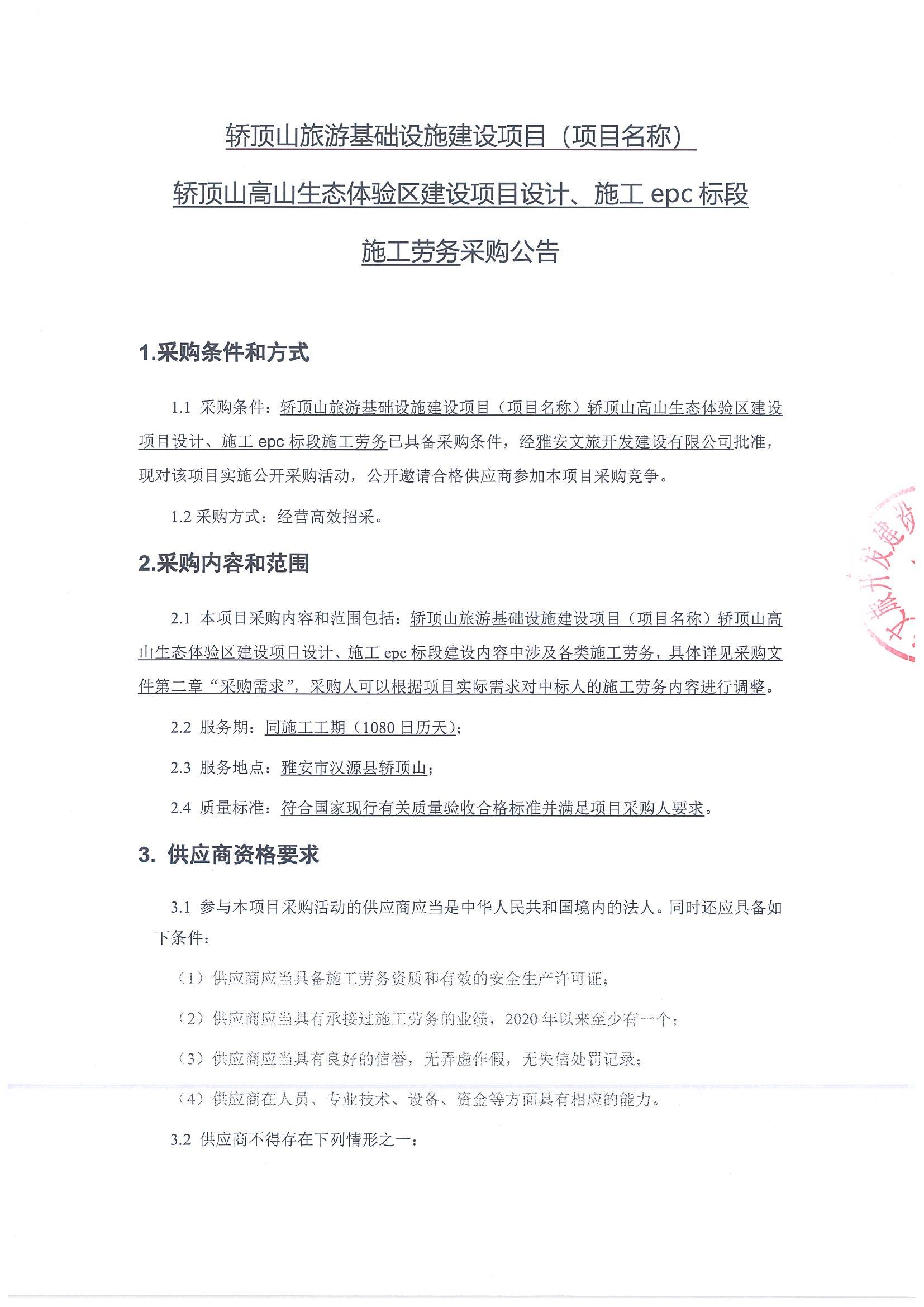 轿顶山高山生态体验区建设项目设计、施工epc标段施工劳务采购公告