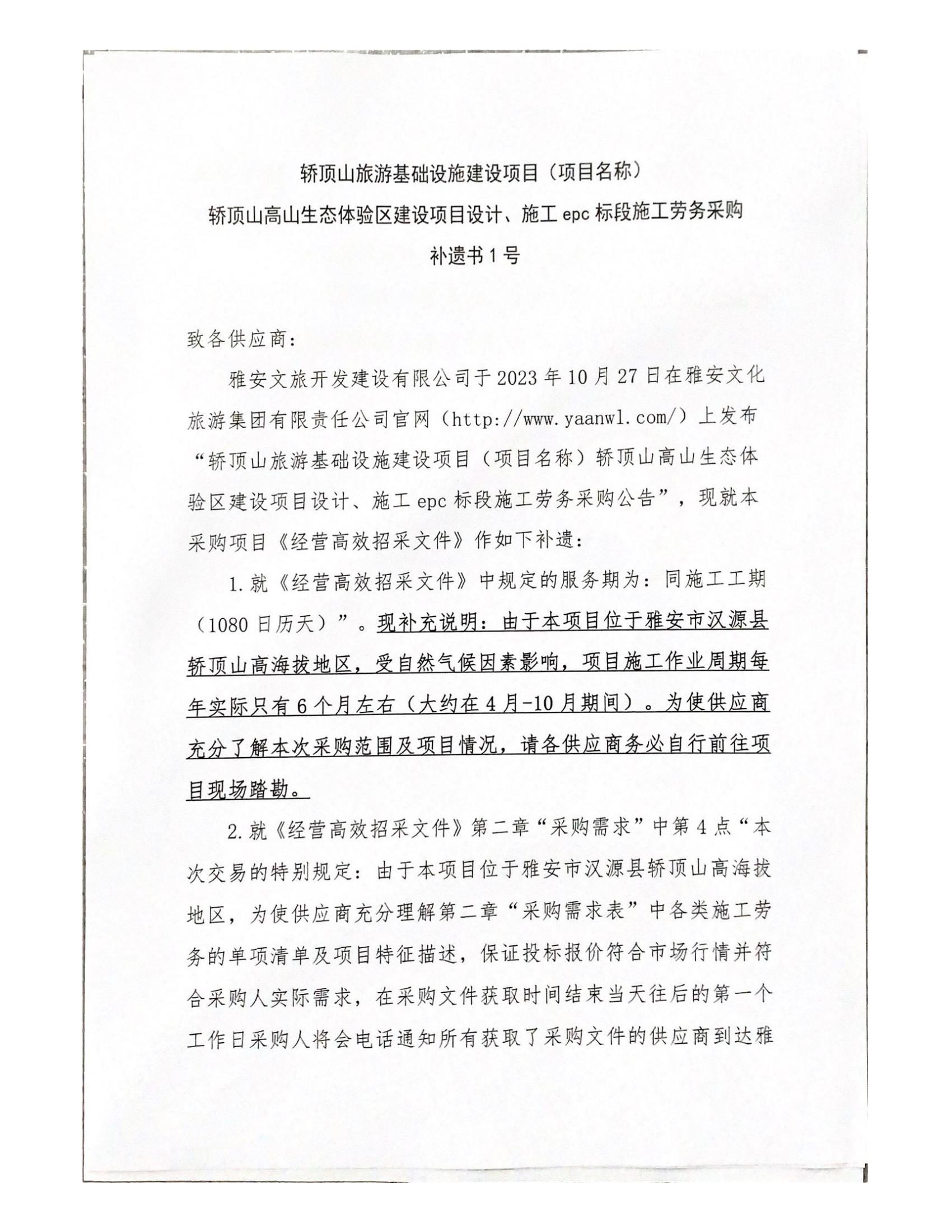 轿顶山旅游基础设施建设项目《项目名称)轿顶山高山生态体验区建设项目设计、施工 epc 标段施工劳务采购 补遗书1号