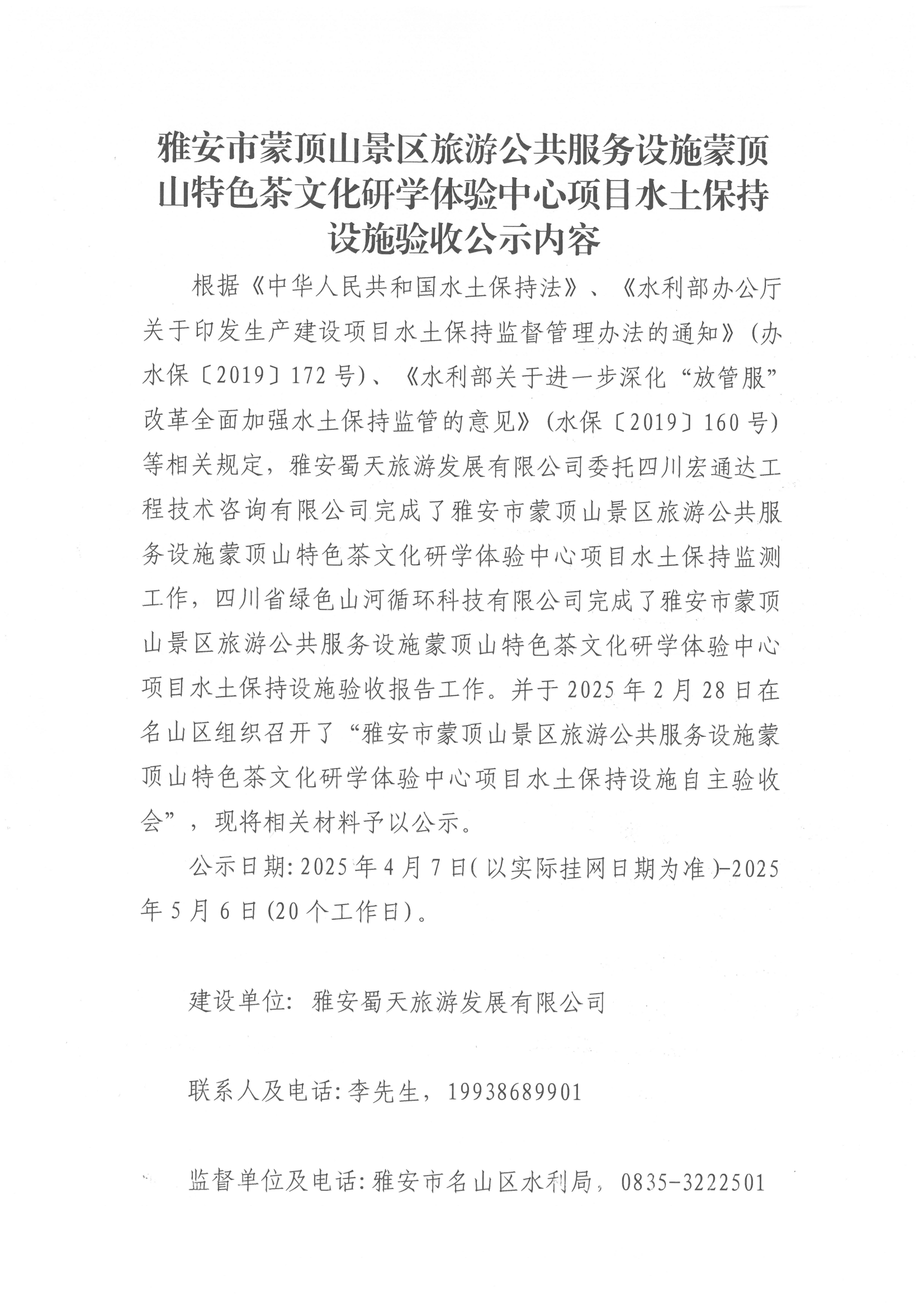雅安市蒙顶山景区旅游公共服务设施蒙顶山特色茶文化研学体验中心项目水土保持设施验收公示内容