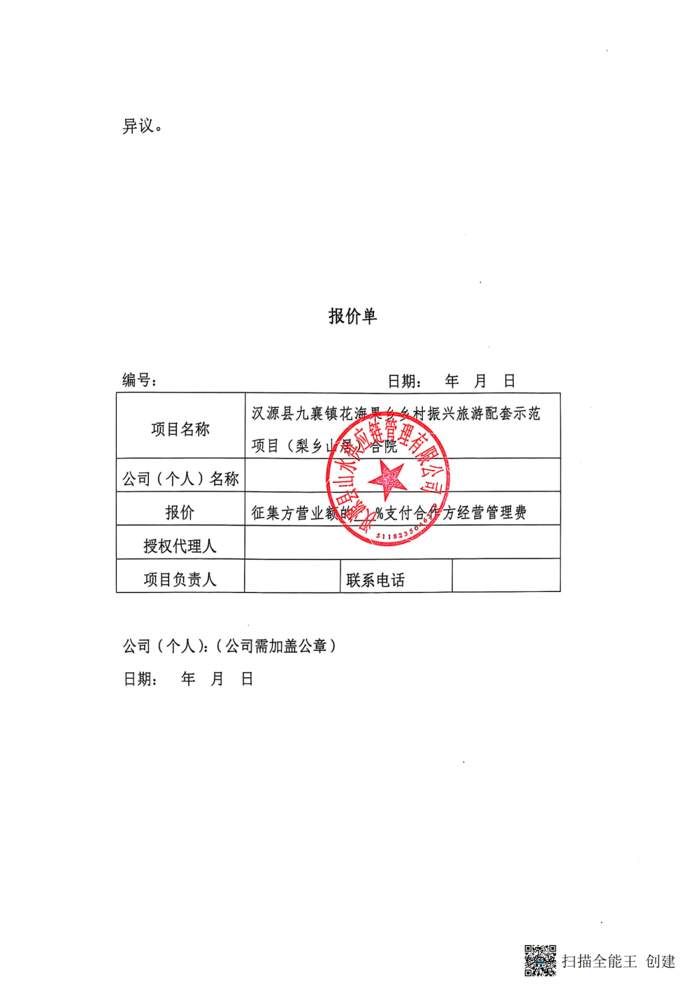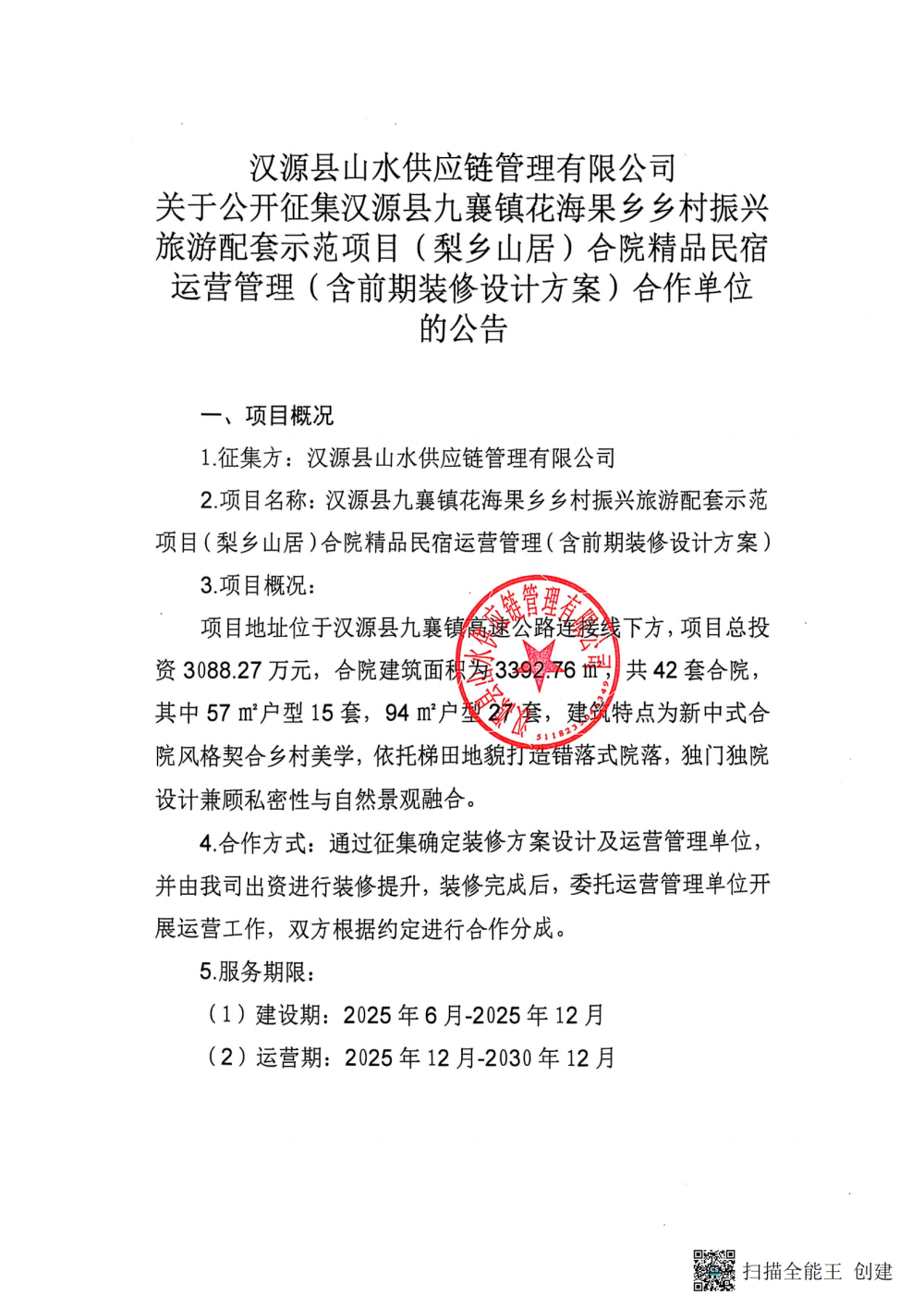汉源县山水供应链管理有限公司关于公开征集汉源县九襄镇花海果乡乡村振兴旅游配套示范项目(梨乡山居)合院精品民宿运营管理(含前期装修设计方案)合作单位的公告
