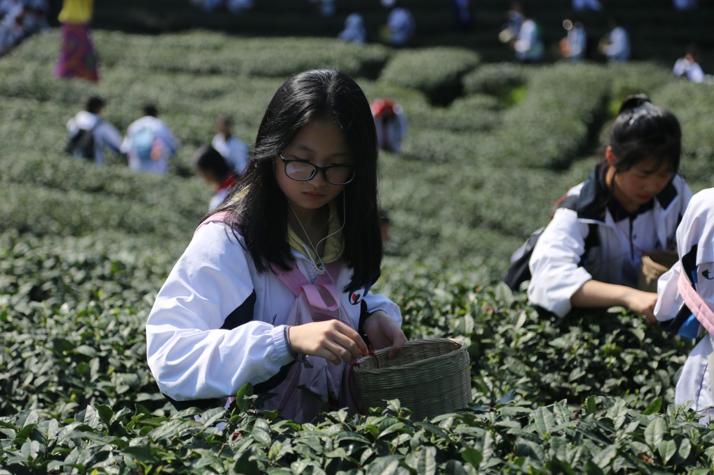 当天,成都棠湖外国语中学一千多名师生来到蒙顶山,展开了一场别开生面的研学之旅,这是该校第一次组织师生开展茶文化研学旅行。在为期一天的研学旅行活动中,同学们在专业导师的带领下,观看蒙顶山独创的龙行十八式茶技,看掺茶师将手中的长嘴铜壶运用自如、提壶把盏,让学生们产生对茶艺文化的向往。深入茶园采摘茶叶,同学们通过亲身体会、实地学习,了解茶叶和采茶制茶的具体知识。“怎样采茶、鲜叶如何炒制、又该如何加工”,一片鲜叶到甘甜的茶汤要经过哪些环节,通过茶人老师傅的悉心教导,如同一把打开“茶”这只潘多拉神盒的钥匙,将同学们引向了喜爱茶叶的大门。