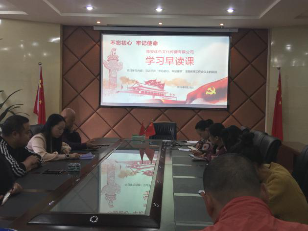 9月25日8:30-9:00,雅安红色文化传播有限公司执行董事赵扬扬组织公司中层以上干部及公司党员开展“不忘初心 牢记使命”主题教育学习早读课,由总经理文爽带头学习,学习内容为习近平同志在“不忘初心、牢记使命”主题教育工作会议上的讲话精神。公司中层以上人员及党员12人参加了学习。